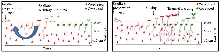 Stale and false seedbeds (Figure 9) can be used to reduce weed density in the crop and are particularly useful in organic production. Success is dependent on conditions that cause weed seeds to germinate: moist soil and temperatures sufficient to cause germination of the desired species. The tillage event used to stimulate weed emergence must be planned to coincide with normal times of weed emergence. Otherwise, tillage before weeds are ready to germinate brings a fresh set of weed seeds to the soil surface, where they may germinate after the false or stale seedbed is completed.